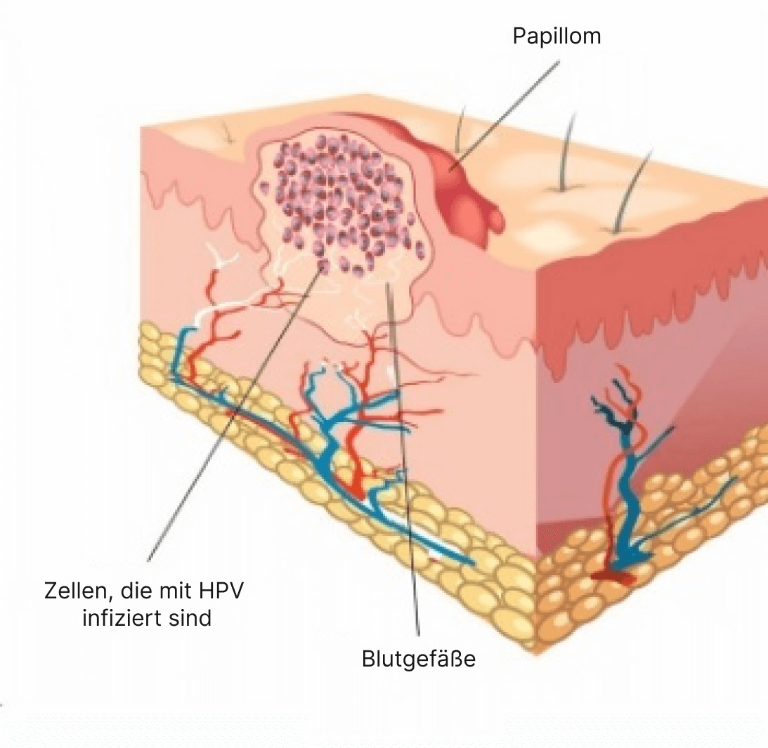 1. HPV-Infektion. Der Prozess beginnt, wenn der Körper mit dem humanen Papillomavirus infiziert wird. Dies kann durch den Kontakt mit infizierter Haut oder Schleimhäuten geschehen, z. B. bei engem Kontakt mit einer infizierten Person oder durch kleine Verletzungen der Haut.